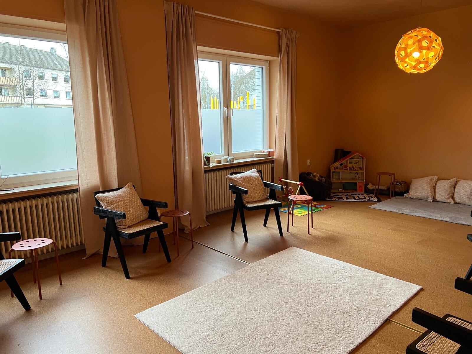 Die Praxis bietet Platz für 3 Behandlungsräume: Ein gemütlicher Raum für Einzelgespräche und kleinere Gruppen, ein kleinerer Behandlungsraum mit Schreibtisch (für Diagnostik) und ein Gruppenraum. Der Gruppenraum bietet ab demnächst zusätzlich eine flexible Bestuhlung, Tische und Yogamatten.